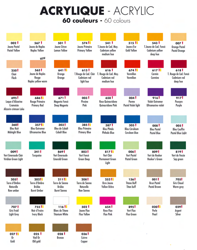 Acrílico acetinado com cores vivas e intensas, oferecendo tons muito puros e numerosas possibilidades de mistura. Com textura untuosa, nem demasiado fluida nem demasiado espessa, a pasta utilizada caracteriza-se por um forte poder cobreante graças a concentração de pigmentos utilizados. Esta pintura acrílica forma ao secar uma película permanente e resistente a água. Estas cores podem-se diluir com água, não ficam amarelas e oferecem uma boa opacidade e uma excelente resistência a luz.