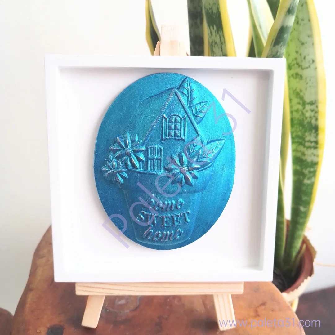 • quadro decorativo com escultura oval azul com casa e texto Home SWEET home