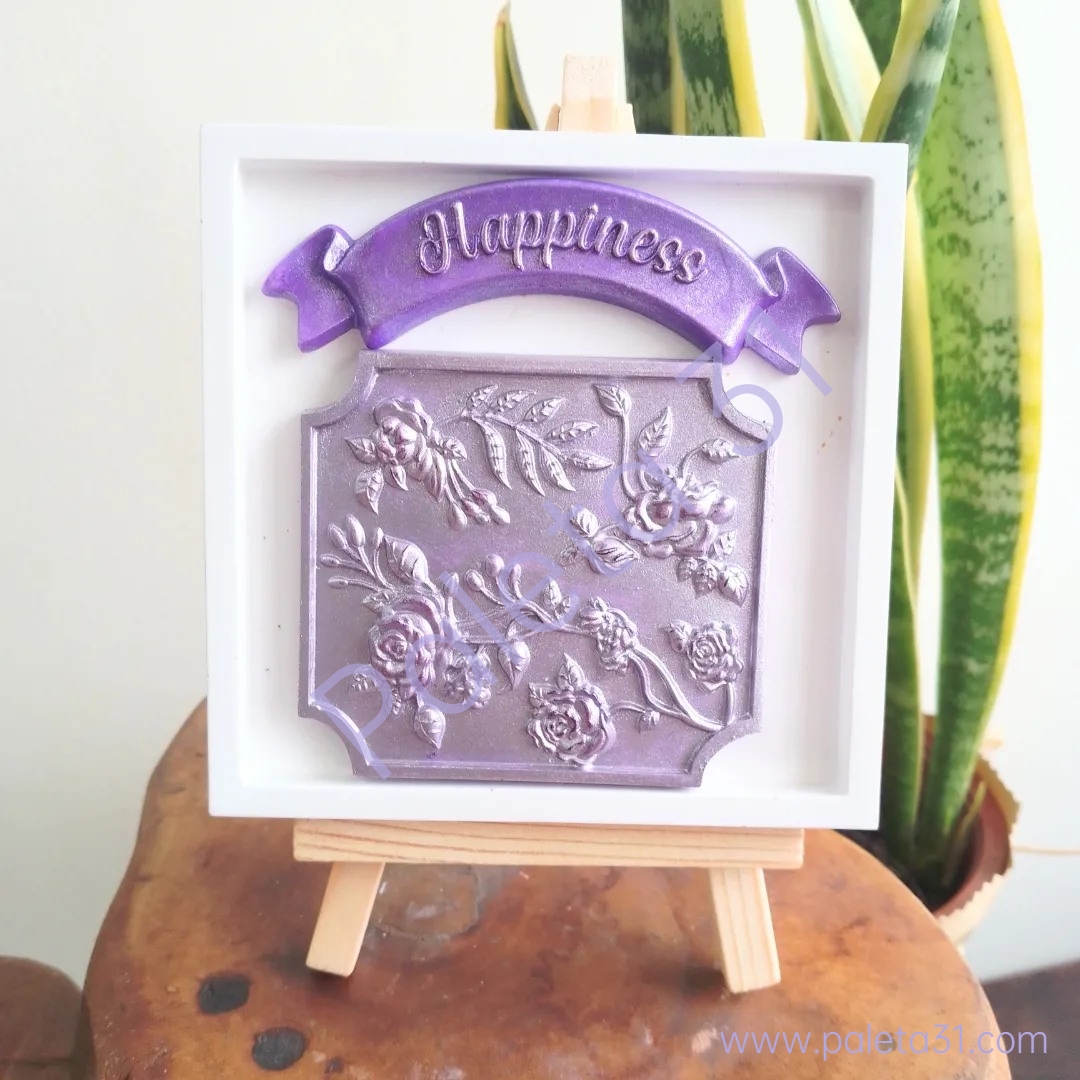 • Quadro decorativo branco com relevo floral roxo e texto 'Happiness' em cavalete