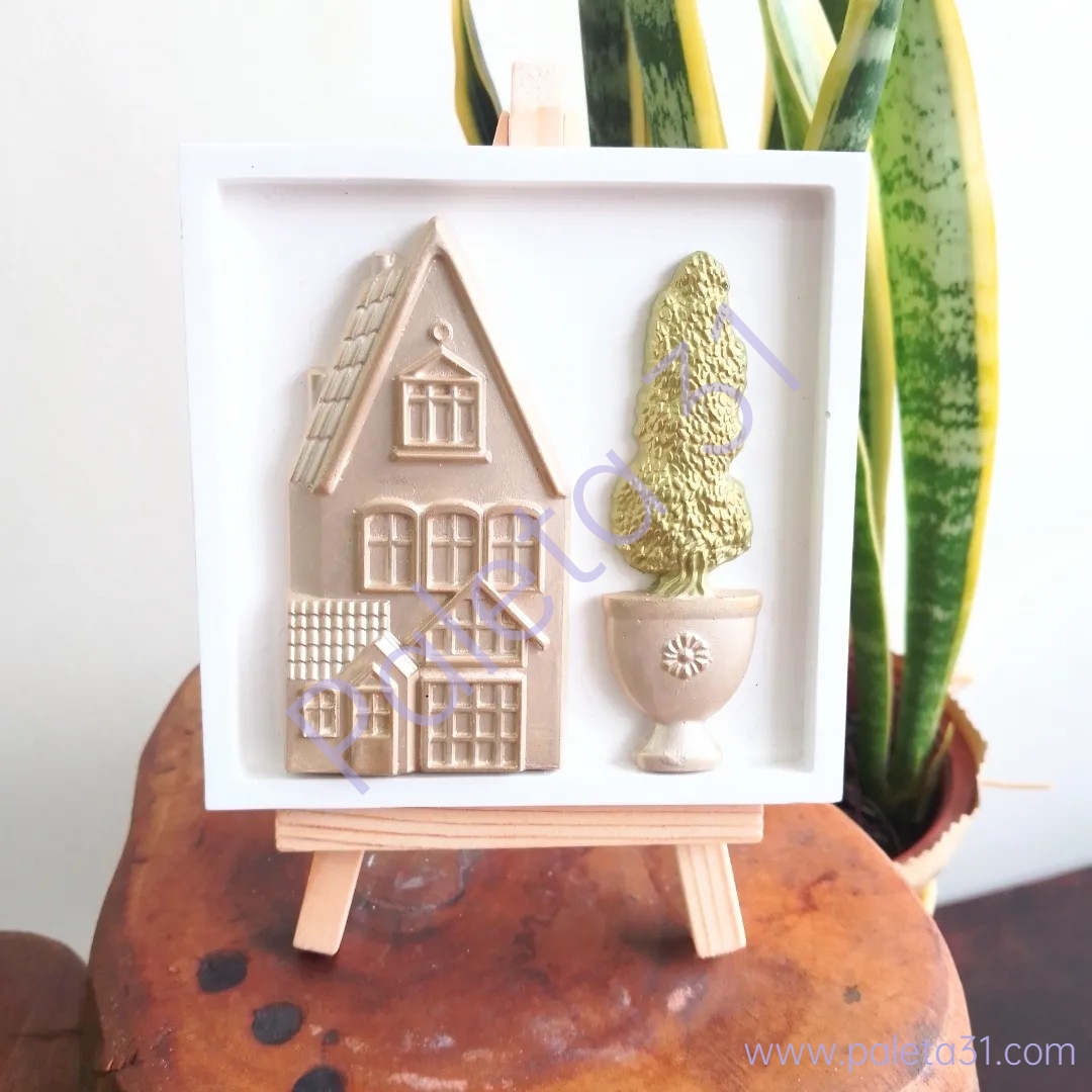 • Miniatura decorativa de casa e vaso com árvore em moldura branca sobre cavalete de madeira ao lado de planta verde em vaso