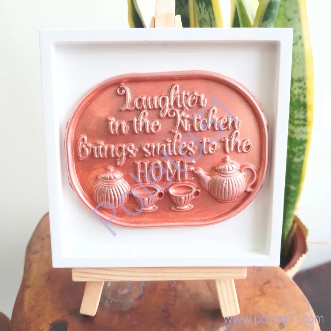 • Placa decorativa com frase inspiradora e ilustrações de bules e chávenas em relevo, moldura branca, sobre cavalete de madeira