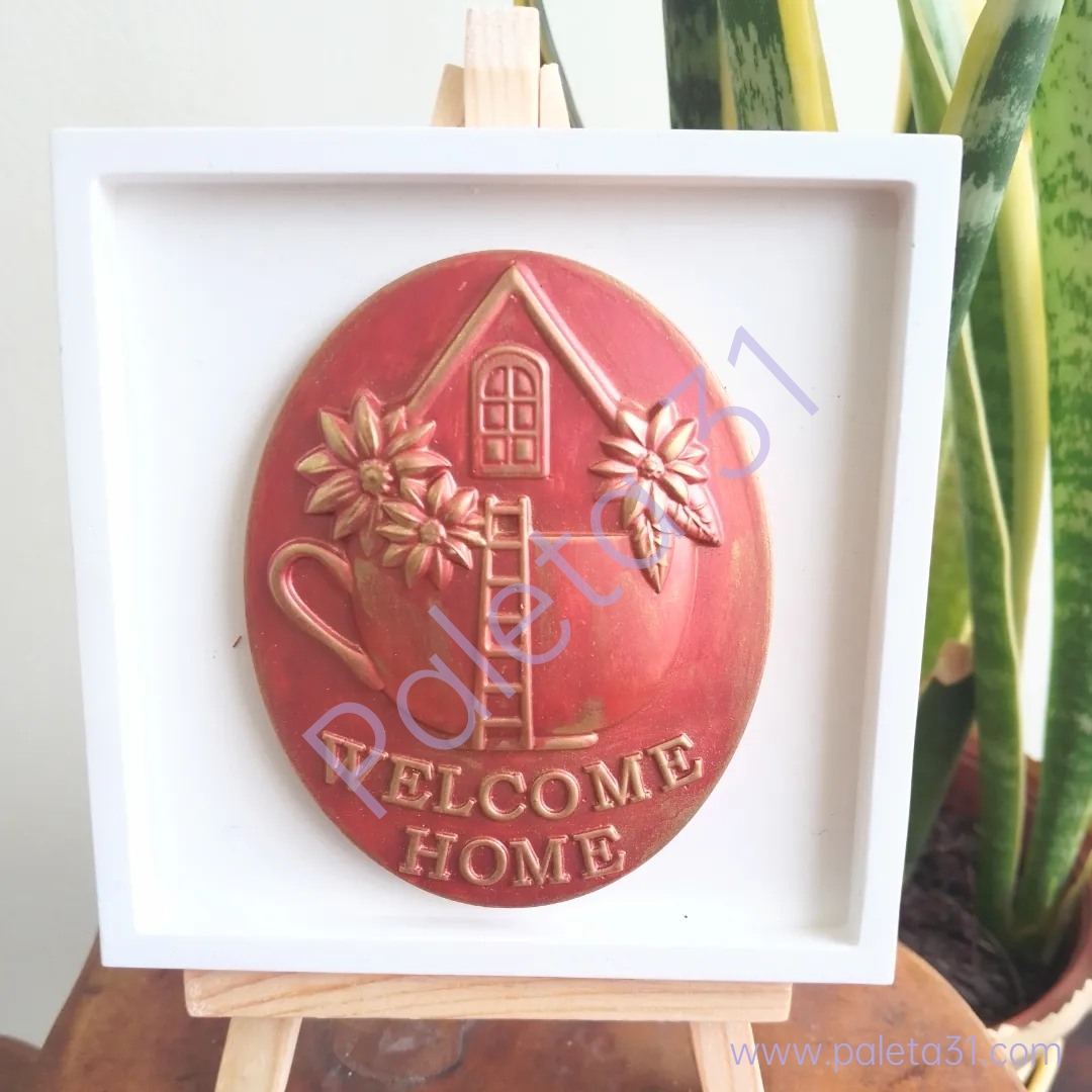 • quadro decorativo branco com relevo vermelho e texto WELCOME HOME em dourado