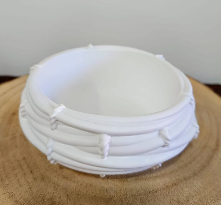 Recipiente branco redondo texturizado sobre madeira