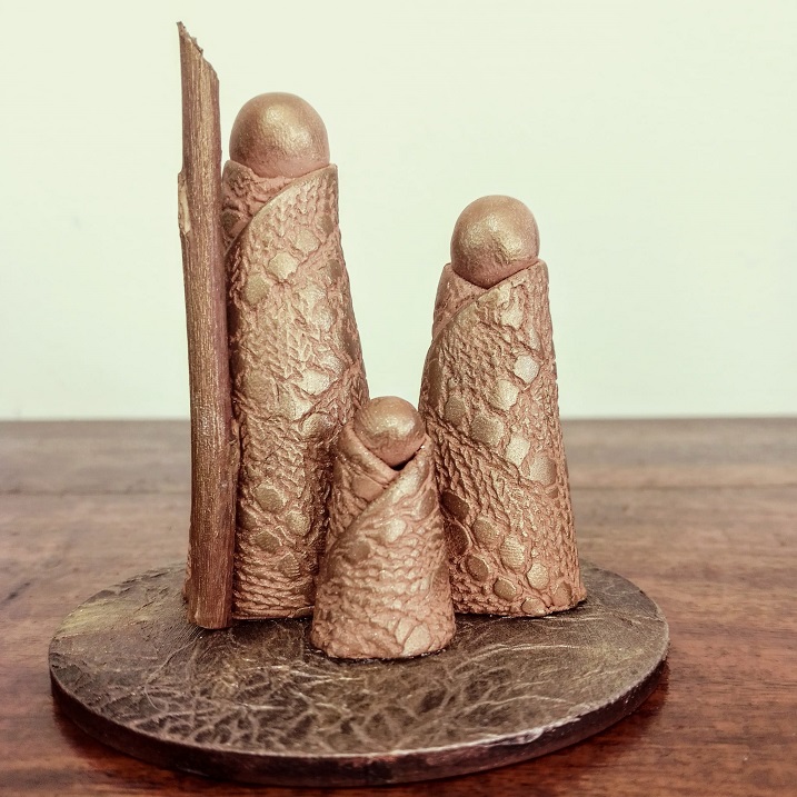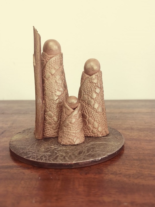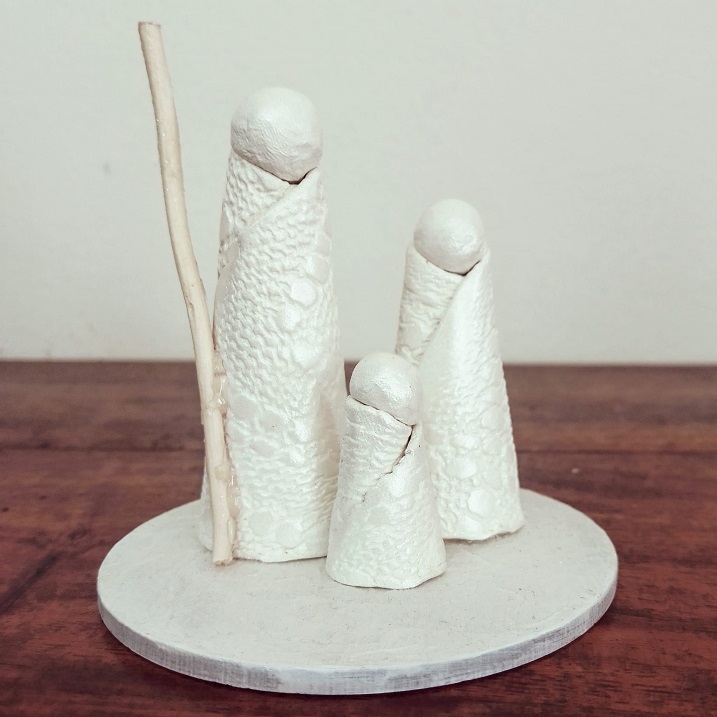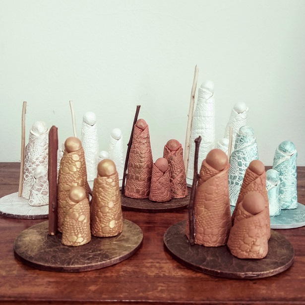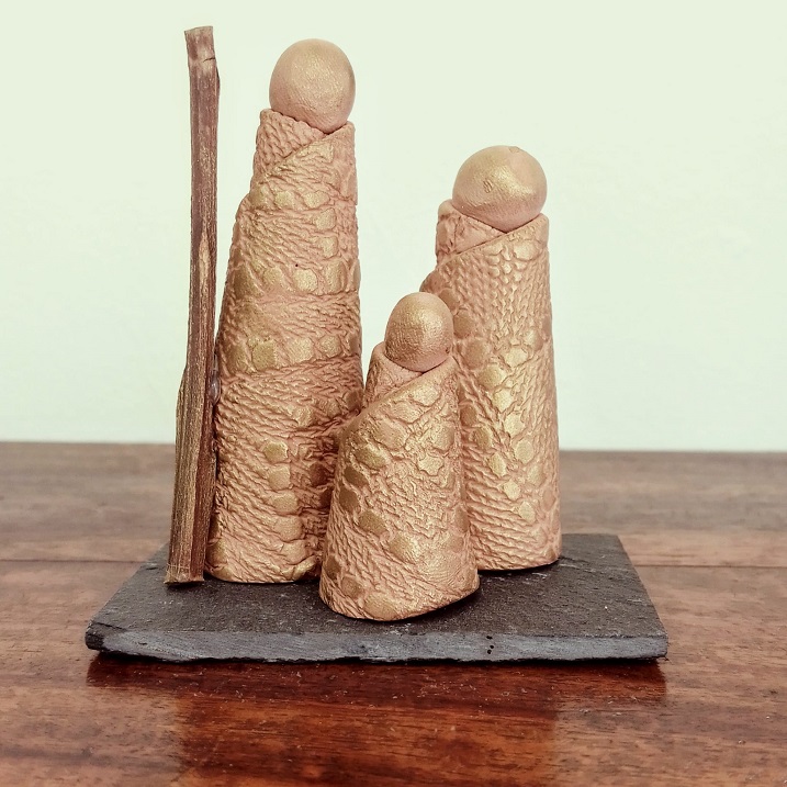 Presépio de argila modelado manualmente, decorado com tecnicas mistas