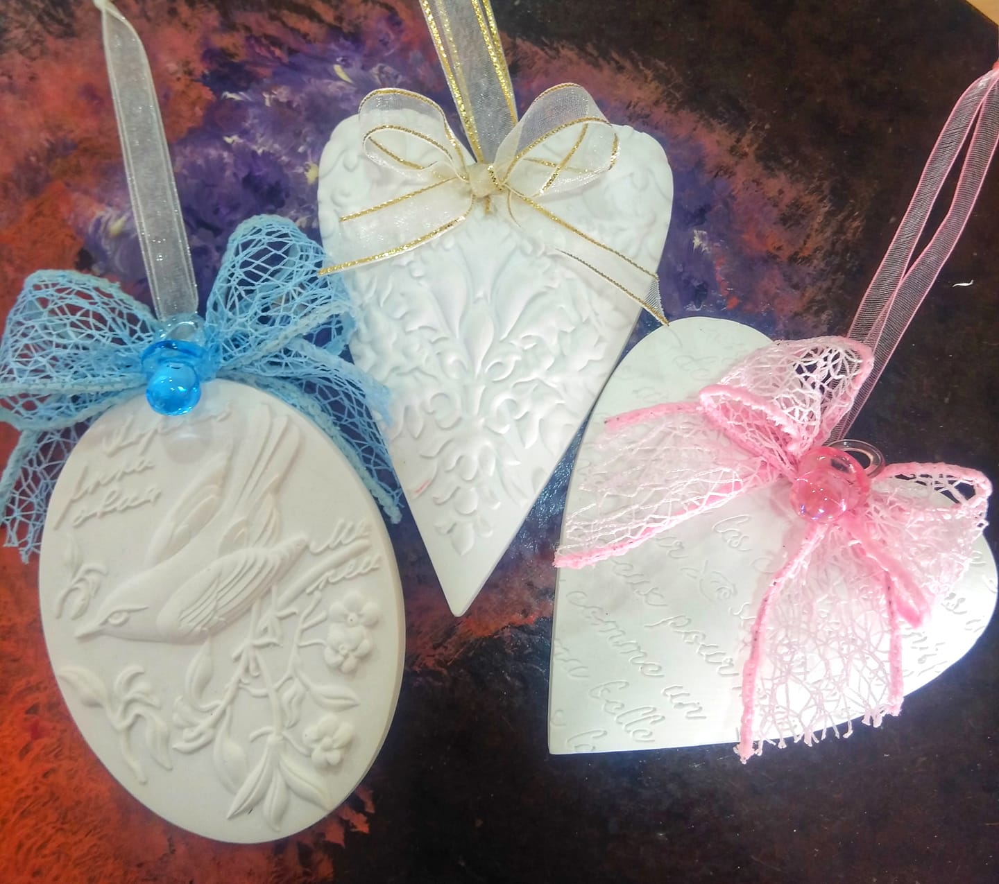 • Três fragrâncias decorativas em gesso com fitas coloridas sobre fundo escuro