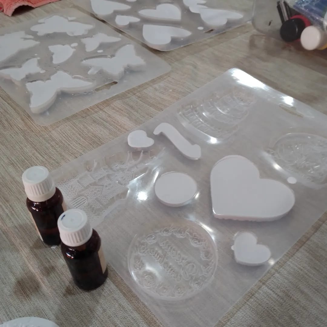 • Moldes transparentes para artesanato com formatos variados e garrafas pequenas ao lado