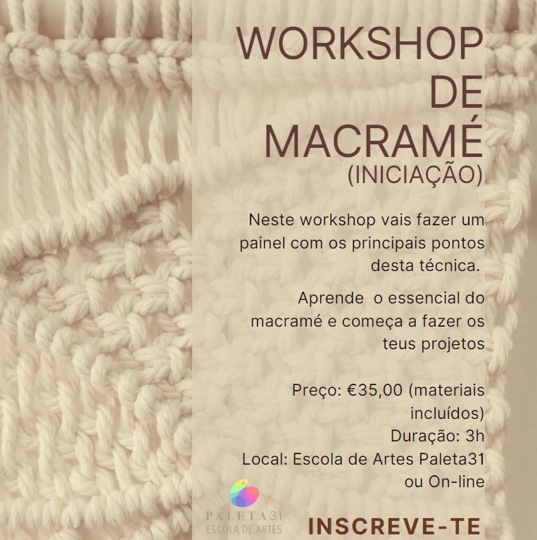 • Cartaz promocional para workshop de macramé com texto e detalhes em macramé de algodão cru